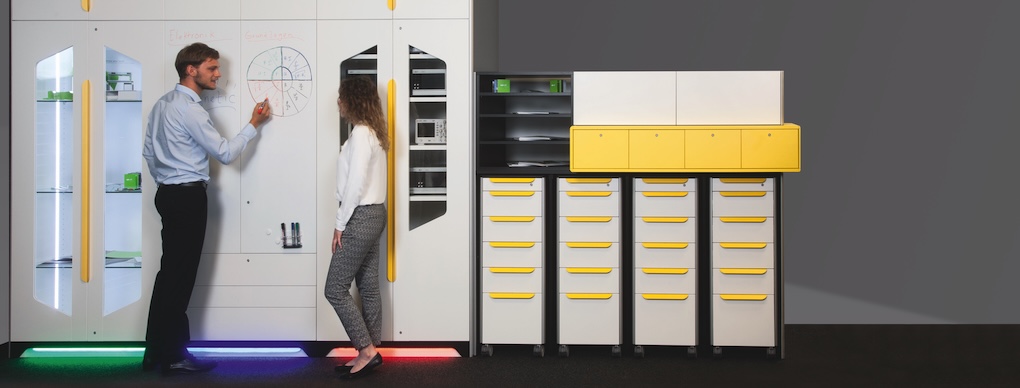 As a complement to laboratory and training facilities, erfi offers innovative, design-award-winning cabinet systems and seating furniture with newly designed fronts and illuminated functional bases (open = green and red = closed). All furniture edges are covered with a high-quality laser edge and guarantee high impact protection (permanent zero joint).